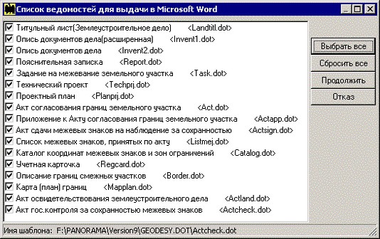 В том случае, если формирование идет с выбором документов из списка, будет предложен диалог для установки необходимого состава отчетных ведомостей. В зависимости от выбранного режима программа предоставляет возможность выбора перечня ведомостей из фиксированного набора (межевое дело, описание земельного участка, обратная геодезическая задача). Состав ведомостей для каждого набора описывается в файле dot.ini. После установки необходимого перечня нажмите кнопку Продолжить.