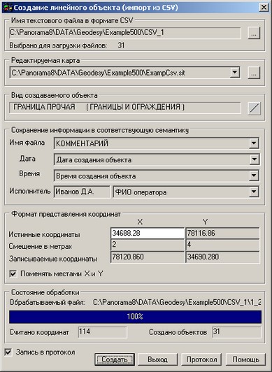 Группа Имя текстового файла в формате CSV предназначена для выбора входного файла или группы файлов с расширением CSV. Если выбран один файл, его полное имя заносится в элемент Имя текстового файла в формате CSV. При выборе нескольких файлов в элементе Имя текстового файла в формате CSV отображается полный путь к каталогу. Раздел Редактируемая карта предназначен для выбора векторной или пользовательской карты, на которой будут созданы объекты. Редактируемую карту можно выбрать из списка открытых карт, а при помощи кнопки «…» - создать новую, или добавить существующую пользовательскую карту. Элемент Вид создаваемого объекта предназначен для выбора условного знака из классификатора редактируемой карты. Группа Сохранение информации в соответствующую семантику предназначена для занесения имени файла(имя файла CSV часто означает имя или номер хода измерений), даты и времени создания объекта, а также фамилии исполнителя в указанные пользователем семантики создаваемого объекта. Имя файла и фамилия исполнителя могут заноситься в любую выбранную семантику строкового типа. Для занесения времени необходима семантика с типом ВРЕМЯ, а дата сохраняется в семантику с типом ДАТА. При наличии у условного знака перечисленных семантик программа автоматически распределяет семантики по соответствующим характеристикам. Если сохранение дополнительной информации не требуется, выберите в каждом списке семантик строку «НЕ ВЫПОЛНЯЕТСЯ». Раздел Формат представления координат предназначен для перестановки местами координат X и Y и их изменения на установленное значение . Строка Истинные координаты заполняется первой парой координат из файла CSV. В строке Записываемые координаты отображаются координаты первого создаваемого объекта, которые зависят от указанных пользователем значений строки Смещение в метрах и включённого режима Поменять местами X и Y. Элемент Запись в протокол позволяет вести протокол создания объектов. Текстовый файл с именем FromCSV.log создаётся в каталоге входных файлов CSV. Кнопка Протокол предназначена для просмотра заполненного протокола в текстовом редакторе WordPad. Кнопка активизируется после выполнения процедуры создания объектов из файлов CSV при включенном режиме Запись в протокол.