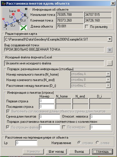 После указания информации о столбцах в группе «Информация о пикетах (строки)» появляются значения соответствующие указанным строкам. Пользователю необходимо указать номер первой и последней строки с информацией о пикетах. Программа автоматически рассчитает сумму длин пикетов, проверит ее на соответствие длине исходного объекта и выдаст величину относительной невязки длин. Если установлена галочка в элементе «выполнить согласование длины объекта и суммы длин пикетов», то программа расставит пикеты с учетом относительной невязки длин. То есть все пикеты, будут расположены между первой и последней точкой метрики исходного объекта. Если длина объекта короче суммы длин пикетов, то отрезки будут сжаты, если длина объекта больше суммы длин пикетов, то отрезки будут растянуты. Корреляция длины отрезка производится в соответствии с его исходной длиной и величиной относительной невязки. Иногда при линейных изысканиях выполняют измерение длин не между смежными пикетами (например: 10-11, 11-12, 12-13), а сразу для нескольких пикетов (например, 10-13). В этом случае длина отрезка включает в себя длины всех трех пикетных расстояний. Программа выполняет анализ на соответствие числа отрезков и номеров пикетов. Число создаваемых пикетов может быть определено по строкам файла (сколько измерили, столько и нанесли), или по номерам пикетов (сколько последовательных номеров указали, столько и нанесли). В группе «Порядок расстановки пикетов в соответствии с количеством» пользователь может проанализировать эту информацию, и указать порядок нанесения пикетов. Пикеты можно создавать прямо на исходном объекте, или на перпендикуляре слева - справа от него. Для того чтобы, наносить пикеты прямо на объекте укажите в группе «Расстояние на перпендикуляре от объекта» в элементе «Lp=» значение 0. Если «Lp=» не равно нулю пикеты будут создаваться либо слева, либо справа от исходного объекта. Данный диалог используется в двух режимах: - расстановка пикетов вдоль объекта (Excel); - расстановка пикетов вдоль объекта с указанием стороны (Excel). Отличие этих двух режимов заключается в порядке нанесения пикетов на перпендикуляре к исходному объекту. Чаще всего линейные изыскания связаны с измерением дорог. Измерения вдоль объекта производятся относительно его осевой линии. Измерения на перпендикуляре, могут быть выполнены как от осевой, так и относительно кромки или бровки дороги. Поскольку ширина дороги на всем ее протяжении непостоянна, возникает необходимость учитывать поправку при нанесении пикетов, за счет ширины дороги. Используйте режим расстановка пикетов вдоль объекта (Excel) если измерения на перпендикуляре выполнялись относительно осевой линии. Режим расстановка пикетов вдоль объекта с указанием стороны (Excel) используйте, если измерения на перпендикуляре осуществлялись относительно некой граничной линии отличной от лосевой (например, кромка или бровка дороги). Во втором случае началом отсчета расстояния на перпендикуляре будет являться не осевая линия, а указанная пользователем граничная линия. Группа Редактируемая карта предназначена для выбора электронной карты, на которой будут созданы объекты. Редактируемую карту можно выбрать из списка открытых карт. Группа Вид создаваемой точки предназначена для выбора вида создаваемого точечного объекта из к