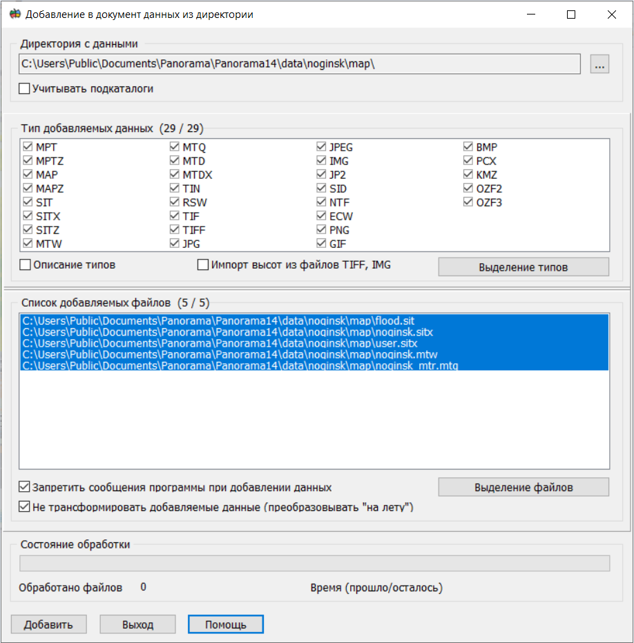 Режим предназначен для добавления в документ всех однотипных данных, находящихся в указанной директории. Для поиска добавляемых данных во вложенных каталогах применяется элемент Учитывать подкаталоги. Тип добавляемых данных указывается в одноименном списке. В документ могут быть добавлены следующие типы данных: - проекты карт местности MPT и MPTZ; - карты местности MAP, MAPZ; - пользовательские карты SIT, SITX, SITZ; - матрицы высот MTW; - матрицы слоев MTL; - матрицы качеств MTQ; - MTD – модели; - TIN – модели; - растровые карты RSW; - импортируемые растровые изображения из форматов TIFF, JPEG, IMG, PNG, GIF, BMP, PCX, KMZ, OZF2, OZF3.