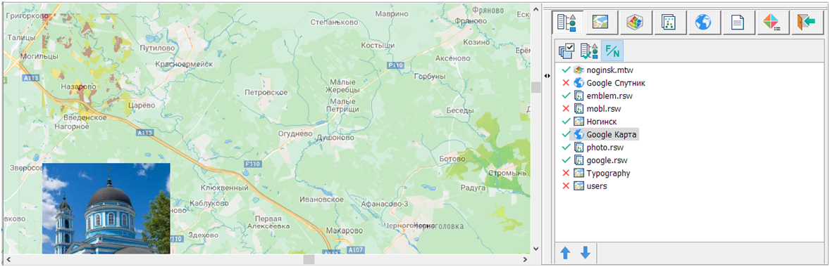 Для классификации вида данных в общем списке предусмотрена индикация элементов в виде пиктограмм. Включение и отключение видимости данных осуществляется с помощью нажатия левой кнопки мыши (Left) в область отображения пиктограммы «галка/крестик» или клавиши «пробел». Названия элементов данных могут быть представлены в виде полного пути или сокращенного названия. С помощью режимов «Выше», «Ниже» осуществляется перемещение выбранного элемента данных на одну позицию. Для изменения порядка отображения нескольких элементов списка доступен режим переноса элементов мышью (Drag&Drop). Выделение элементов списка осуществляется с помощью комбинаций клавиш Ctrl + Left, Shift + Left. Для восстановления стандартного порядка отображения по видам данных необходимо использовать режим «Установить стандартное расположение данных». Для обработки всех видов данных предусмотрены режимы: «Отображение», «Над картой», «Границы видимости», «Перейти к ... », «Яркость/Контрастность», «Добавить», «Добавить из директории», «Закрыть».