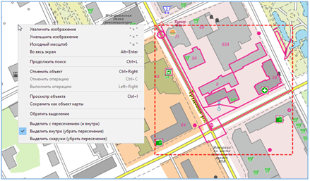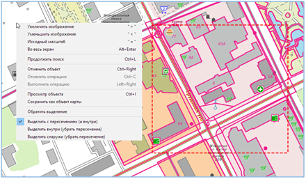 Настройка состава и параметров выделения выполняется в режиме главного меню Поиск - Параметры выделения. Для изменения условий отбора объектов после нанесения области необходимо по правой кнопке мыши вызвать контекстное меню и выбрать один из режимов: - выделить внутри (убрать пересечение)