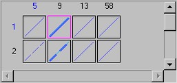 В левой части закладки внизу расположена таблица Назначение вида объектов серии. В каждой клетке этой таблицы находится изображение, соответствующее значениям семантик. Для первой семантики эти значения (пороги), подписаны сверху по горизонтали, для второй - в левом столбце. Синим цветом выделено умалчиваемое значение для серии по данной семантике. Смена умалчиваемого изображения производится нажатием правой клавиши мыши на выбранном изображении в таблице. Если между порогами есть еще значения семантик, то для всех значений действует отношение <=. Пример: У семантики три порога: 1 , 4, 5. Тогда при значениях семантики <=1 объект будет иметь внешний вид из 1 клетки, при значениях > 1 и < =4 - вид из 2 клетки и соответственно при значениях <= 5 - вид из 3 клетки. При двух семантиках серии, соответствующий вид объекта стоит на пересечении выбранных порогов (значений семантики). Над таблицей Назначение вида расположена линейка инструментов для назначения порогов серии и назначения внешнего вида конкретным сочетаниям семантик.