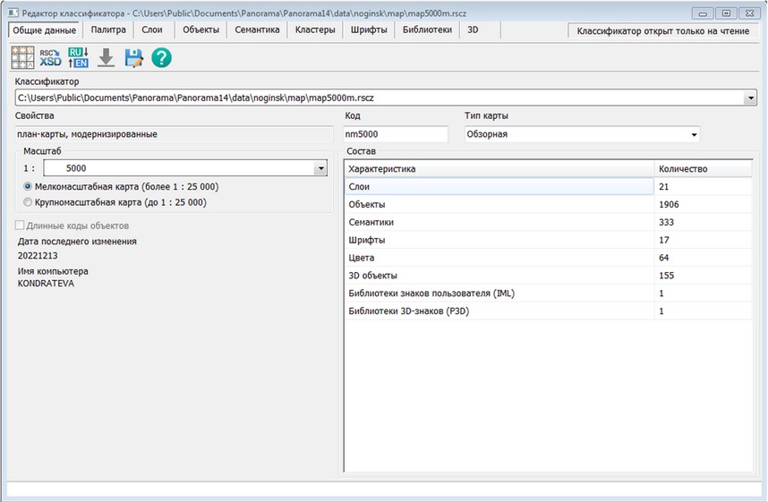 Код классификатора (7 символов) редактируется при нажатии на поле Код. Данное поле является справочным. В правой части закладки представлена информация о составе классификатора: общее число слоев, объектов, семантик, шрифтов, цветов, 3D виды объектов, пользовательские библиотеки iml и 3D знаков. В левой нижней части диалога отображается информация о дате последнего изменения классификатора и имя компьютера, на котором выполнялось редактирование. Верхняя часть диалога содержит дополнительную панель с задачами, которые включают следующие режимы: - - - - - -