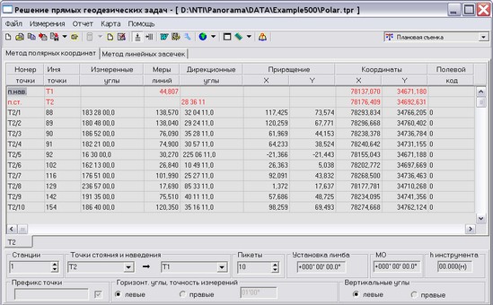 Ввести в таблицу  исходные данные либо вручную (пример), либо из ранее созданного файла исходных данных (пункт Открыть в меню Файл или кнопка Открыть на панели инструментов. При этом если предварительно был построен теодолитный(тахеометрический) ход, то при совпадении названия введенной точки с какой либо точкой хода ее координаты будут введены в таблицу автоматически. При необходимости введенные данные можно подкорректировать (важно: по окончании исправления ячейки таблицы необходимо нажать клавишу Enter).