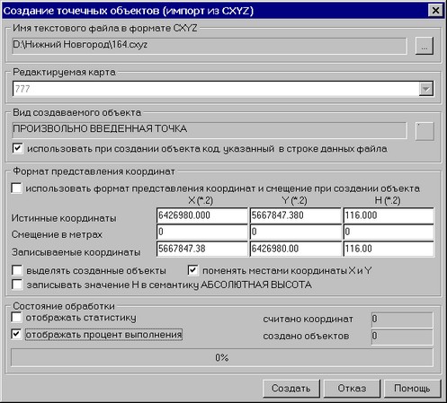 Группа Имя текстового файла в формате CXYZ предназначена для выбора входного файла или группы файлов с расширением CXYZ или CXY. Если файл выбран, его полное имя заносится в соответствующий диалога. Раздел Редактируемая карта предназначен для выбора векторной или пользовательской карты, на которой будут созданы объекты. Редактируемую карту можно выбрать из списка открытых карт. Элемент Вид создаваемого объекта предназначен для выбора условного знака из классификатора редактируемой карты. Если установить флаг использовать при создании объекта код, указанный в строке данных файла, то при нанесении пикетов они будут создаваться каждый своим кодом. При этом для полной автоматизации процесса необходимо предварительно настроить цифровой классификатор карты. Суть настройки заключается в создании специального слоя и точечных объектов, соответствующих кодам исходного файла. Значение кода должно быть указано в качестве ключа точечного объекта. Группа Формат представления координат предназначена для установления ряда настроек, управляющих форматом координат. Если не установлен флаг использовать формат представления координат и смещение при создании объекта, то программа будет использовать для создания объектов исходные данные «как есть» и наносить пикеты на карту с точностью до сантиметров (в метрах = 6426980.00). В противном случае формат координат будет соответствовать, указанному в параметрах настройки, а к координатам будет добавляться значение смещения с абсолютным знаком, то есть с учетом знака минус. Для выделения новых объектов после нанесения на карту используйте флаг Выделять созданные объекты. Чтобы преобразовать систему координат CAD систем (AutoCAD, MicroStation и др.) к системе координат ГИС, используйте флаг Поменять местами координаты. Если необходимо кроме координаты Н записывать значение высоты в семантику, установите соответствующий флаг. Группа Состояние обработки, предназначена для управления потоком отчетных и статистических данных. Данные параметры повышают информативность процесса, но снижают скорость обработки данных. Если Вам необходимо получит максимальную скорость загрузки пикетов снимите галочки в следующих элементах: Использовать при создании объекта код, указанный в строке данных файла, Выделять созданные объекты и Отображать статистику. Отображение процентов выполнения также снижает производительность, но в значительно меньшей мере, чем указанные выше настройки.