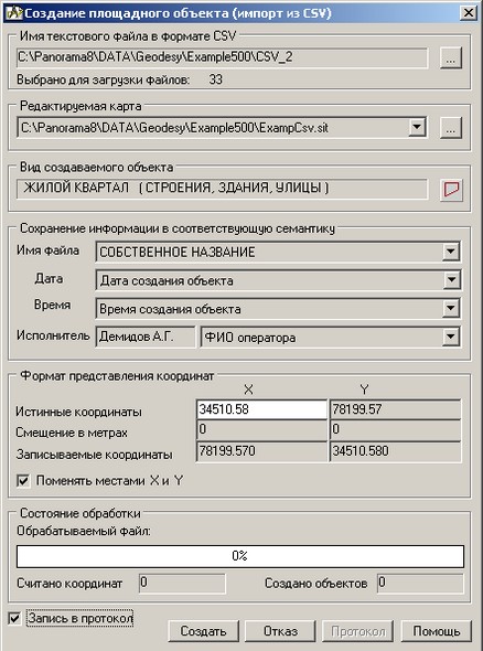 Группа Имя текстового файла в формате CSV предназначена для выбора входного файла или группы файлов с расширением CSV. Если выбран один файл, его полное имя заносится в элемент Имя текстового файла в формате CSV. При выборе нескольких файлов в элементе Имя текстового файла в формате CSV отображается полный путь к каталогу. Раздел Редактируемая карта предназначен для выбора векторной или пользовательской карты, на которой будут созданы объекты. Редактируемую карту можно выбрать из списка открытых карт, а при помощи кнопки «…» - создать новую, или добавить существующую пользовательскую карту. Элемент Вид создаваемого объекта предназначен для выбора условного знака из классификатора редактируемой карты. Группа Сохранение информации в соответствующую семантику предназначена для занесения имени файла(имя файла CSV часто означает имя или номер хода измерений), даты и времени создания объекта, а также фамилии исполнителя в указанные пользователем семантики создаваемого объекта. Имя файла и фамилия исполнителя могут заноситься в любую выбранную семантику строкового типа. Для занесения времени необходима семантика с типом ВРЕМЯ, а дата сохраняется в семантику с типом ДАТА. При наличии у условного знака перечисленных семантик программа автоматически распределяет семантики по соответствующим характеристикам. Если сохранение дополнительной информации не требуется, выберите в каждом списке семантик строку «НЕ ВЫПОЛНЯЕТСЯ». Раздел Формат представления координат предназначен для перестановки местами координат X и Y и их изменения на установленное значение . Строка Истинные координаты заполняется первой парой координат из файла CSV. В строке Записываемые координаты отображаются координаты первого создаваемого объекта, которые зависят от указанных пользователем значений строки Смещение в метрах и включённого режима Поменять местами X и Y. Элемент Запись в протокол позволяет вести протокол создания объектов. Текстовый файл с именем FromCSV.log создаётся в каталоге входных файлов CSV. Кнопка Протокол предназначена для просмотра заполненного протокола в текстовом редакторе WordPad. Кнопка активизируется после выполнения процедуры создания объектов из файлов CSV при включенном режиме Запись в протокол.