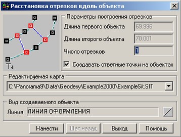 В группе Параметры построения отрезков указана длина выбранных объектов. Необходимо ввести число отрезков, на которое будут разбиты выбранные объекты. Группа Редактируемая карта предназначена для выбора электронной карты, на которой будут созданы объекты. Редактируемую карту можно выбрать из списка открытых карт. Группа Вид создаваемого объекта предназначена для выбора вида создаваемого линейного объекта из классификатора редактируемой карты. Кнопка Шаг назад предназначена для отмены операции по созданию объектов на редактируемой карте.