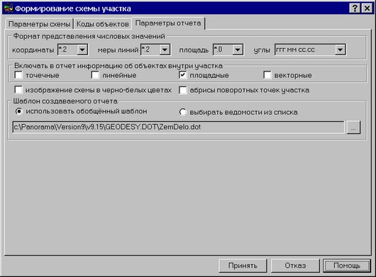 На странице Параметры отчета, устанавливается по какому шаблону формировать отчет и формат числовых значений. Формат представления в отчете координат регламентирует количество знаков после запятой и число знаков до запятой (от десятичной точки влево). Используйте это свойство для уменьшения значащих позиций и разгрузки отчета. Формат представления мер линий определяет только число знаков после запятой. Формат представления углов, позволяет выводить информацию в отчет в следующих вариантах: гг мм сс.сс - градусы, минуты, секунды, сотые доли секунд; гг мм сс.с - градусы, минуты, секунды, десятые доли секунд; гг мм сс - градусы, минуты, секунды; гг мм.мм - градусы, минуты, сотые доли минут; гг мм.мм - градусы, минуты, десятые доли минут; гг мм - градусы, минуты; гг.гггг - градусы, доли градусов.