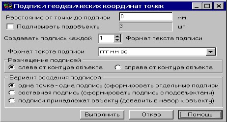 В диалоге необходимо указать некоторые параметры создания подписей: - расстояние от точки объекта до подписи в миллиметрах; - формат текста подписи (вид представления градусной величины геодезических координат); - указать размещение подписей (слева или справа от контура выбранного объекта); - выбрать вариант создания подписей и др.
