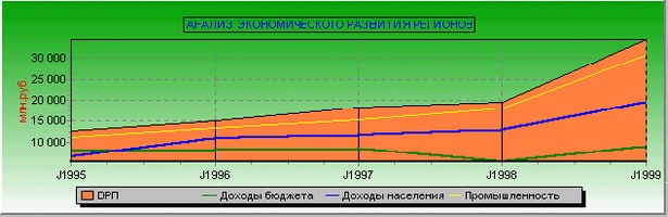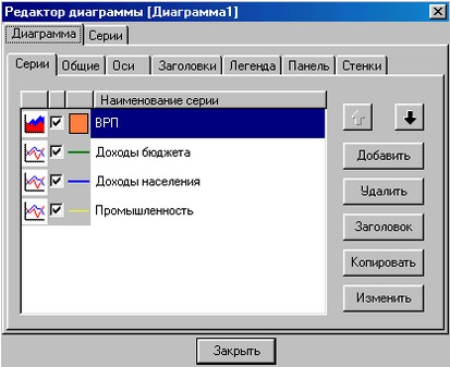 Закладка Серии Содержит серии графика. Серией называется набор точек графика. На графике серии соответствует отдельная линия или ряд столбцов. Если в графике несколько серий, будет показываться несколько линий или ряд столбцов. В большинстве случаев их значения строятся по одинаковому закону и две и более серий одновременно показываются в графике для сравнения. Например, на рисунке показан график, состоящий из четырех серий. Первая показывает валовой региональный продукт (ВРП); вторая – доходы бюджета; третья – доходы населения; четвертая – промышленность.