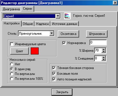 Для создания новой серии нужно нажать кнопку Добавить, а затем в появившемся диалоге выбрать тип серии. После этого в списке на странице Серии появляется строка новой серии. Здесь можно переопределить тип, цвет и видимость серии, щелкнув на соответствующие зоны. Кнопка Добавить используется для добавления других серий, кнопка Удалить –для удаления текущей серии. После нажатия кнопки Заголовок можно определить заголовок серии, нужно нажать кнопку "Заголовок", кнопки Копировать - создать новый экземпляр такой же серии в этом же графике, кнопки Изменить - изменить тип текущей серии.