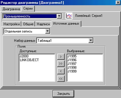 Выпадающий список ниже закладки позволяет определить тип источника данных для серии: - Нет данных -серии не назначается источник данных на этапе проектирования. - Случайные значения - набор случайных чисел. Бывает полезен при формировании заготовки серии, чтобы без указания реальных данных визуально оценить возможности той или иной серии. - Набор данных - позволяет указать (в качестве источника данных) набор данных, значения полей которого будут использоваться для формирования точек серии. В качестве набора данных может указываться Таблица или Запрос. К моменту выбора полей компонент Таблица или Запрос должен быть помещен на форму и связан с нужной таблицей. Требуемый набор данных выбирается из выпадающего списка Набор данных. Список X позволяет выбрать поле набора данных, значения которого будут последовательно откладываться по оси абсцисс. Список Y позволяет выбрать поле набора данных, значения которого будут последовательно откладываться по оси ординат. Соответствие между значениями полей по двум осям определяется принадлежностью к одной записи набора данных. Выбор поля в списке Метки привязывает его значения в виде меток к оси абсцисс. В качестве меток могут использоваться символьные поля и поля типа даты. - Замечание 1. Не все типы серий требуют значений по осям X или Y. Для серий типа "круговая диаграмма", "гистограмма" и "горизонтальная гистограмма" можно указывать значения только по одной из осей и значения меток. - Замечание 2 . Для серий типа "поверхностный график" требуется задание значений по оси Z. - Замечание 3 . Для серий типа "пузырьковый график" требуется задание радиуса. - Отдельная запись позволяет указать (в качестве источника данных) отдельную запись из набора данных, значения полей которой будут использоваться для формирования точек серии. Чтобы задать отдельную запись в качестве источника данных, нужно в выпадающем списке Набор данных выбрать набор данных. Затем из списка доступных полей выбрать необходимые ("перенести" их в список выбранных полей). - Замечание . Не все типы серий поддерживают работу с отдельной записью. Типы серий, поддерживающие работу с отдельной записью : гистограммы, линейный график, площадной график, точечный график, круговая диаграмма. - Вычислитель позволяет указать (в качестве источника данных) компонент Вычислитель, значение которого будут использоваться для формирования точек серии. К моменту выбора компонент Вычислитель должен быть помещен на форму. Чтобы задать Вычислитель в качестве источника данных, нужно из списка доступных вычислителей выбрать необходимые ("перенести" их в список выбранных вычислителей). - Замечание . Не все типы серий поддерживают работу с Вычислителем. Типы серий, поддерживающие работу с Вычислителем: гистограммы, линейный график, площадной график, точечный график, круговая диаграмма.