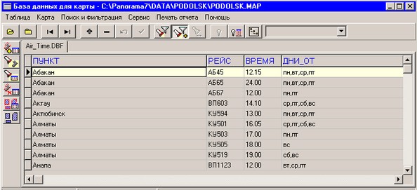 В качестве логических операций можно использовать AND, OR, NOT. В качестве примера задания условий фильтрации приведем следующие выражения: [Площадь] <= '400' [Тип] = 'Линейный' or 'Точечный' Первое выражение обеспечивает отбор всех записей, для которых значение поля площади не превышает 400, а второе - отбор записей, поле Тип которых содержит значение Линейный или Точечный. Для символьных полей возможен поиск по частичному совпадению. С этой целью используется символ '*', который заменяет последовательность символов произвольной длины. Предположим, необходимо составить список городов, чьи названия начинаются на букву "А": [Пункт] = 'А*' Выходные данные для этого запроса представлены на рисунке.