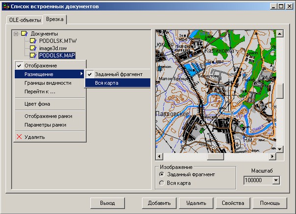 При активном режиме Заданный фрагмент положение врезки относительно окна диалога влияет на вид врезки в документе карты.