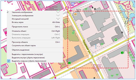 Настройка состава и параметров выделения выполняется в режиме главного меню Поиск - Параметры выделения. Для изменения условий отбора объектов после нанесения области необходимо по правой кнопке мыши вызвать контекстное меню и выбрать один из режимов: - выделить внутри (убрать пересечение)