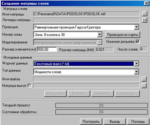 При построении матрицы слоев по текстовому файлу необходимо установить значение Текстовый файл в поле Формат данных и задать имя в поле Имя файла.
