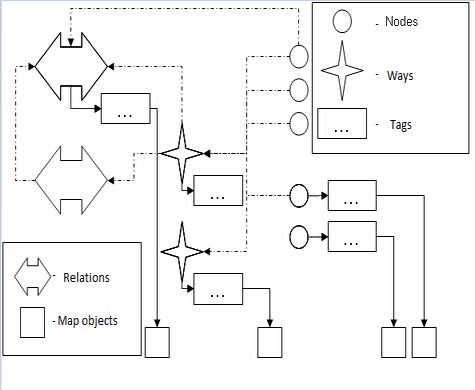 Ways - a set of nodes. They can be independent objects (if there are descriptive tags), as well as be part of relationships. For example: <way id="8880955" version="4" timestamp="2018-08-18T14:17:53Z" changeset="0"> <nd ref="64796309"/> <nd ref="64796310"/> <tag k="waterway" v="riverbank"/>
