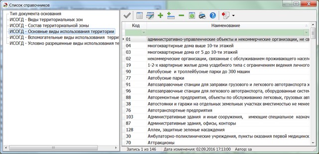 Справочник «Тип документа основания» заполнен общепринятыми наименованиями документов. Справочник «Виды территориальных зон» содержит список территориальных зон принятый в Градостроительном кодексе РФ. Справочник «Состав территориальной зоны» содержит список назначения для каждой территориальной зоны.