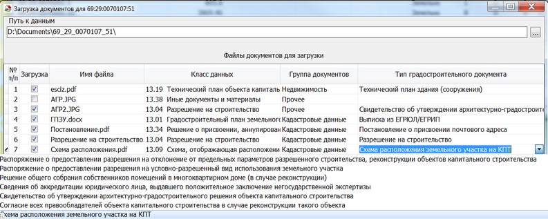 По файлам, находящимся в выбранной папке, строится таблица. Колонки таблицы соответствуют атрибутам создаваемого документа. В колонке Загрузка помечаются файлы, по которым будут созданы документы. Документы создаются для 13 раздела ИСОГД «Дела о застроенных или подлежащих застройке земельных участков». Колонка Класс данных - класс документа по справочнику «Классификатор сведений, документов, материалов, размещаемых в информационной системе». Значение можно выбрать из выпадающего списка наименований. Если не указать значение, то у документа будет класс «Иные документы и материалы». Колонка Группа документов - группа по справочнику «Группа документов». Значение можно выбрать из выпадающего списка наименований групп. Если не указать значение, то у документа будет группа «Прочее». Колонка Тип документа - тип по справочнику «Тип градостроительного документа». Поле заполняется автоматически в случае соответствия имени файла сокращенному наименованию документа из справочника. Тип документа можно выбрать из выпадающего списка наименований. Если поле не заполнено или название файла не совпадает ни с одним сокращенным наименованием документа из справочника, ему устанавливается тип «Прочее». По сокращенному наименованию типа документа сформируется наименование документа. Колонка Код документа - классификация по справочнику «Код документа». Значение можно выбрать из выпадающего списка кодов документа. Если не указать значение, то документу установится код «558221000000 -ПРОЧИЕ».