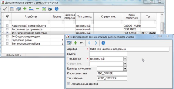 Поле Справочник заполняется в том случае, если указан тип данных «справочник». Поле Единица измерения заполняется символьной информацией, например, кв. м (квадратный метр). Поле необязательное для заполнения. Поле Ключ семантики. Значение используется для синхронизации данных в базе и семантической характеристики объекта карты. Например, в режиме «Импорт кадастровых данных из семантики объекта». Поле Тэг шаблона. Значение используется при формировании отчетов по шаблонам. Поле Обязательный атрибут. Если в поле выставлена «галочка», то при добавлении нового участка атрибут, автоматически добавляется в список дополнительных. При этом необходимо заполнить поле «Ключ семантики».