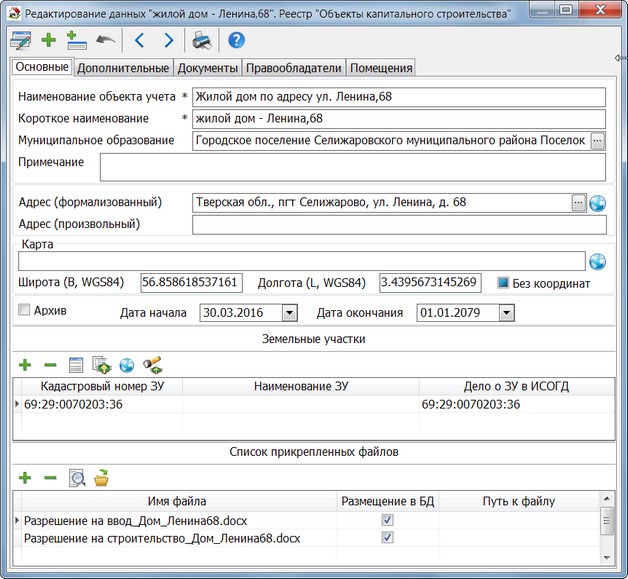 Широта, Долгота – координата связывания объекта учета с картой. Значение заносится при выборе режима «Связать объект и запись» или «Связать запись с картой по координате» из формы списка. Карта должна поддерживать систему координат WGS84. Возможен ручной ввод координат. Для этого укажите геодезическую координату WGS84 в градусах. При нажатии на кнопку ici_011 «Показать на карте» на карте выделяется связанный с записью объект на карте или показывается координатная точка в виде мигающего креста.